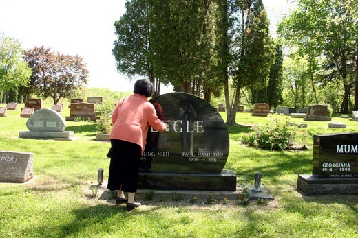 下圖: 聶華苓深情擦拭丈夫安格爾墓碑上的水漬