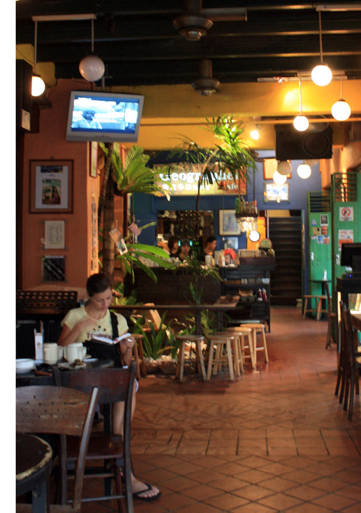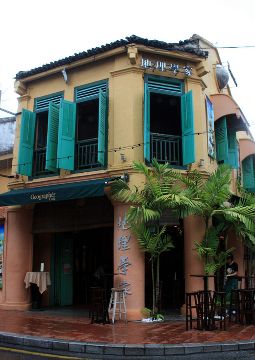 西洋風格,外觀亮麗的「地理學家」咖啡館,脫胎於老式中國店鋪,沒有任何門窗,客人穿堂風般,隨意進出,濕熱的氤氳中,流淌著抒情的爵士樂。從棕梠枝葉間,不經意瞥見對街深藍燙金的「儒林」二字,古城的便利商店,名字竟也饒富古意。