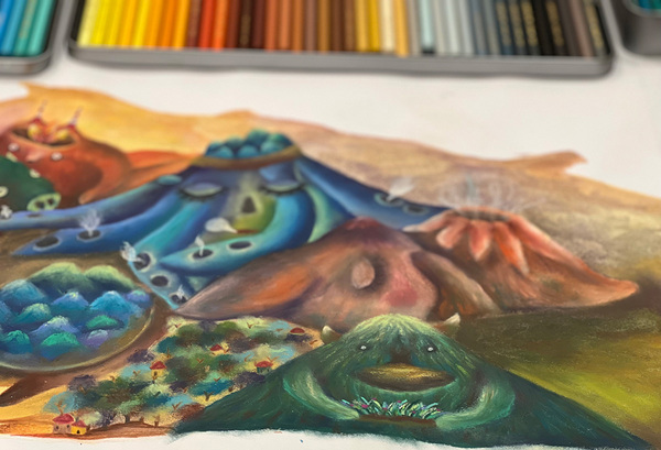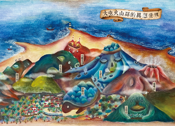 近來研究顯示,原本的休眠火山可能是座活火山,為了呼應『火山復活』的概念,特別採用不同媒材進行混搭創作。先以水彩打底,呈現休眠的靜態,再以厚重濃彩的蠟筆覆蓋,帶出隱藏於火山體中的飽滿能量,最後以鉛筆勾勒細節,進電腦做氛圍烘托,讓充滿故事性的奇幻旅程在紙上開展,歡迎一起進入大屯火山的異想世界⋯