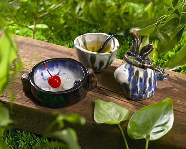 將裝盛點心的淺盤,以釉色自由渲染出夢境般的奇幻世界。盤子外觀猶如Alice踏入仙境的神奇樹洞,從洞口可以看見佈滿藍綠青苔的岩石,靜靜佇立在夏天的湖面。