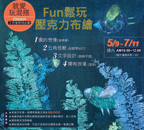 【5月。夏季 工作室】週六上午『Fun鬆玩壓克力布繪』5/9~7/11(端午節連假休息一次)
