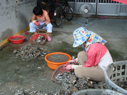 過5年的訓練,他的身手已不輸媽媽,每小時可鋟2台斤的蚵,一天大
