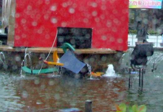 多不敵強風倒落,木片雞身裂成2片,在噴水池內飄來飄去