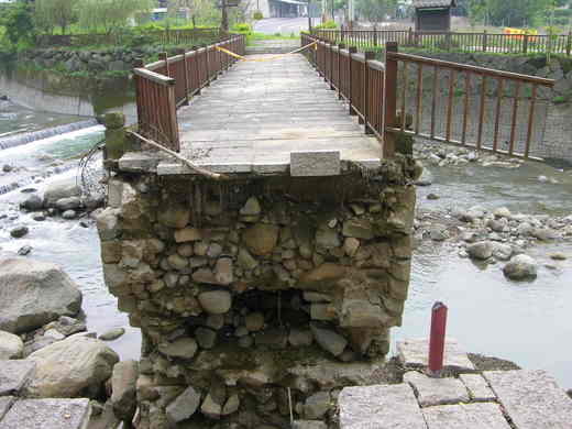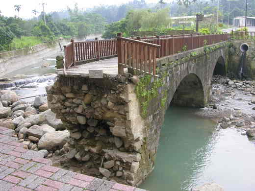 嘉義縣竹崎鄉著名的清水溪日式古橋石拱橋,歷經八七水災、921、1022大地震,以及賀伯、納莉、桃芝、敏督利、艾利等颱風豪雨,都沒有毀壞橋梁,但88水災被無情的大水和巨石沖毀橋頭,村長王松茂很難過的說,大水過後應該還會有大量魚群在清澈的溪流中出現。