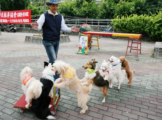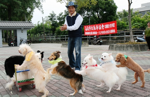 【記者林宜樟/嘉義報導】「爆米花來,推車囉!」嘉義市民蔡慶榮從事訓犬工作35年,他最近3年收養流浪狗,訓練狗兒特技表演,會推車、跳圈和滾輪,變成狗明星,讓這些流浪狗也有春天。