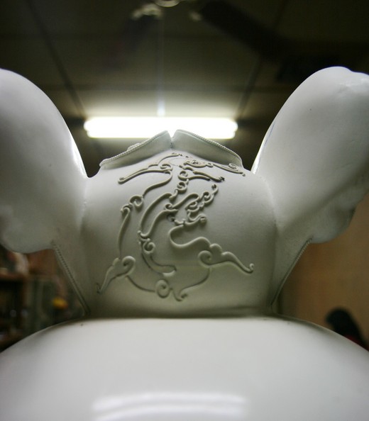 三太子的偶頭由吳春星親自開模製造上漆,衣服設計好樣式後交給工廠代工,「這邊是設計,很難一次大批量產。」把縫製好的戰甲先放上衣架,再將偶頭擺上,五峰旗插上背,一尊原創的世運電音三太子就呈現在眼前。