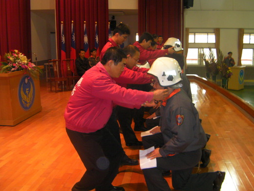 消防局為新建消防人員辦師徒授業儀式新建人員有名台大農業碩士及一名女消防隊員。