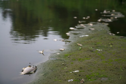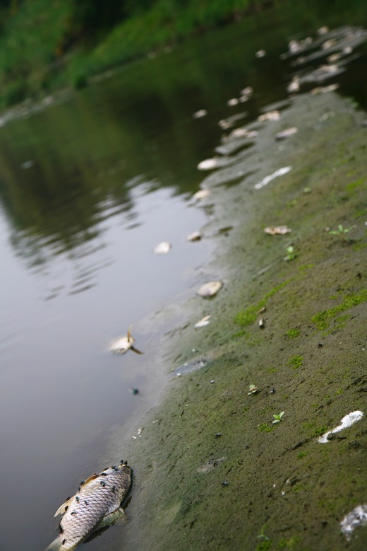 兩天散步時聞到惡臭,發現河岸邊數百公尺都有魚群死亡,居民懷疑