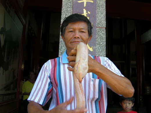 今天上午他由南新里長葉全成及里民陪同,在公園牛將軍神像前,擲茭杯請示,決定擇吉日放生回池塘。「長這麼大頭一次看到白鱔魚」,「頭形好像去牛角的牛將軍」,大人小孩圍著大臉盆觀賞白鱔魚,七嘴八舌討論,
