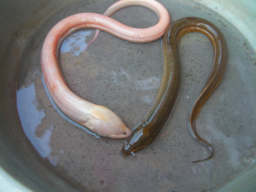 「民間相傳看見白鱔魚會帶來好運!」,嘉義縣家畜疾病防治所長李建裕、技士蔡明吉鑑定後說,黃鱔大都為黑色,出現白色機率很低,是基因缺損造成的白子化。