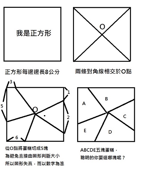 公平分蛋糕的方法。學者說,兩個人時,由一個人先切蛋糕,然後另外一個人先選。因為先切的人怕被另一個先選的人挑那個比較大的蛋糕,所以先切的人會盡量切的公正。 反思:手穩的人可以先切,眼睛好的人寧願後選。