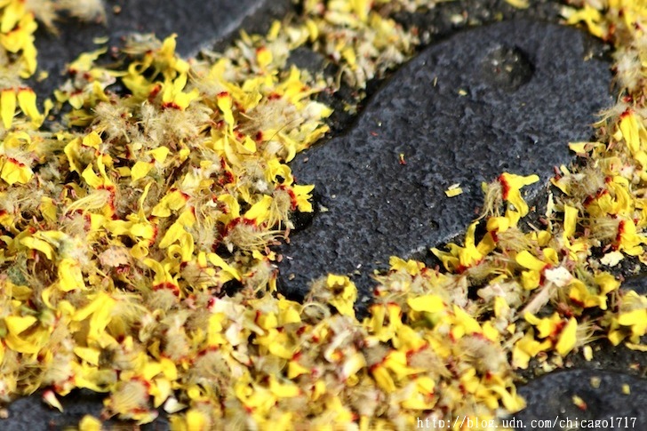 秋風習習, 鮮黃的小花飄落在人行道上、草地上, 有如灑下陣陣黃金雨, 巒樹因此有個美麗的名字~「台灣金雨樹」。
