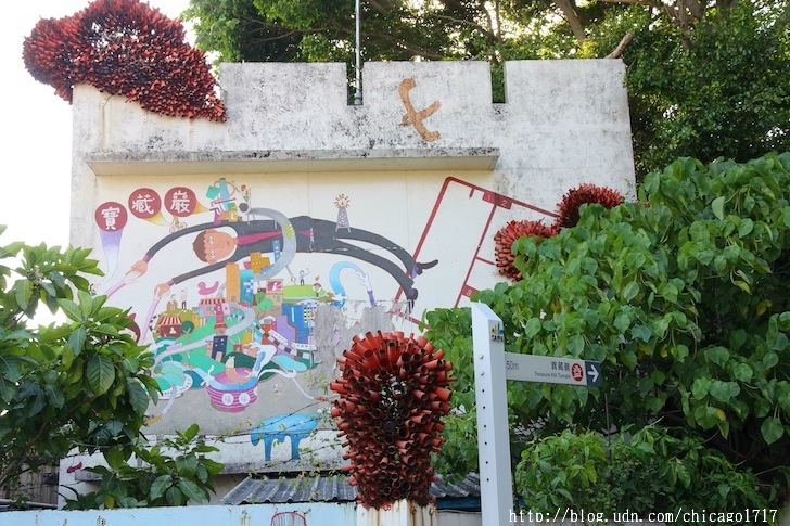 白牆上又是一幅頗富童趣的彩繪圖, 路標上指引著方向與距離, 還有五十公尺抵達「寶藏巖」。