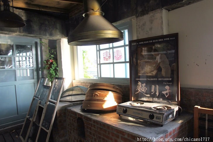 窗前古老的爐灶上還擺著電影裡的廚房用具, 以及電影海報「麵引子」。 這裡是拍攝電影的場景, 敘述老兵對著窗外的山光水色揉著麵團, 一邊揉一邊將無限的思鄉也揉進了麵團裡了!