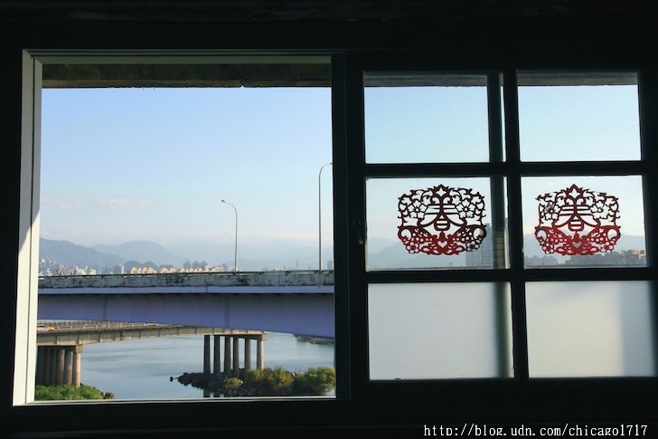 探出窗外, 下方溪水靜靜流淌, 綠草如茵, 候鳥飛來, 人們坐臥草地上或溪邊釣魚, 或在寬敞的步道上慢跑、騎單車, 看來幽靜閒適一派輕鬆自在。