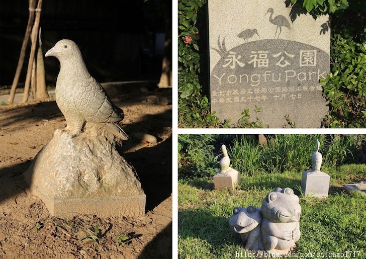 這裡是永福公園, 擺放著動物的石雕。 可愛的小青蛙石雕讓一旁的小朋友忍不住爬上爬下的玩耍。