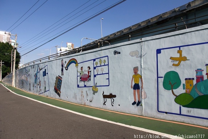 天空清澄透藍、綠樹蔭濃, 這裡是台北市汀州路三段230巷的停車場, 進入「寶藏巖國際藝術村」之前可在此停車, 再步行入內參觀。 停車場旁一面以市民生活為主題的彩繪高牆很吸引人, 在彩繪高牆旁的是線條優美的福和橋。