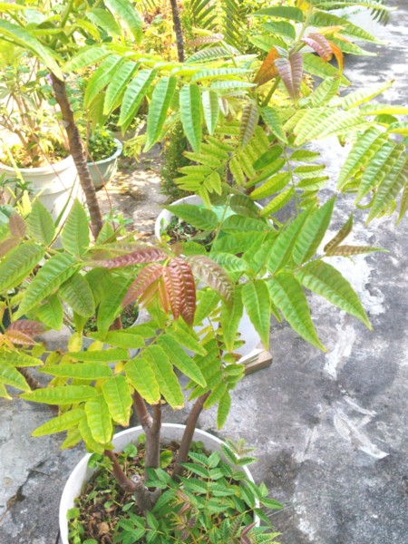 香椿為養生食品亦是良藥之材,其根、皮、葉、花和果實皆可食用亦能入藥,由於市場上顯少販賣,所以得自己栽種,我特地到花市買了兩三盆小香椿樹回家培植,原先都不到一尺高,但香椿樹是喬木,會越長越高,為了不使它成長茁壯,我常拔取其頂端之嫩葉,抑止它長高大。