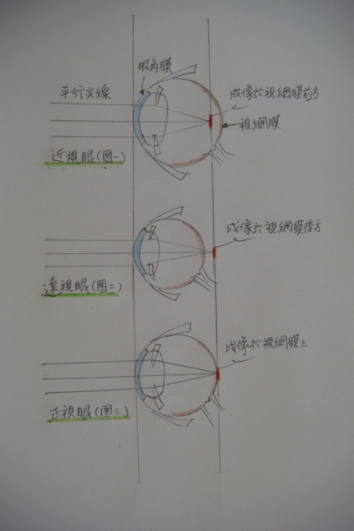什麼是近視? 近視就是遠處看不清楚,近處物體看得清楚.在學理上是眼軸長於理想的長度,眼睛看到的物體在視網膜前聚焦未在視網膜上成像,見(圖一).