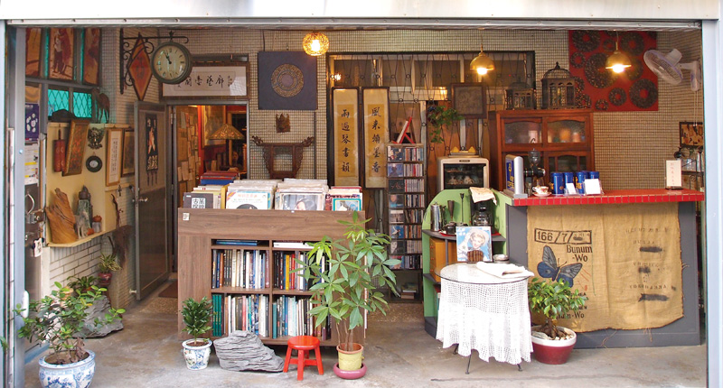 店面正前方是一座黑胶老唱片展示架,旁边是咖啡工作区及吧台,连着一道狭长的走廊,与外面巷道隔着一片浅绿透明压克力窗,窗边摆了木雕桌椅。客人逛店累了,可以点一杯咖啡坐下来歇脚。走廊左侧是一大片书墙,书种以通俗大众类为主。从一块“兰台艺廊”匾额下走进屋内就是“客厅”,为书店核心区,艺品类大部分摆置于此,四周堆得满满,同时也是购物结账区,备有桌椅,熟客可以坐下来与主人谈天。靠墙一整个书柜都是台湾研究相关书籍文献。