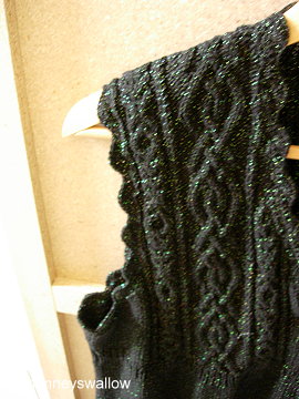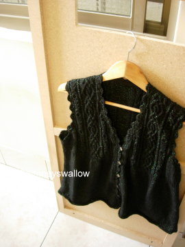 這款線材有點類似夏紗材質,卻選到黑色線難打又傷眼,再者就是這個交叉麻花花樣,讓我織了一年多。一開始選到太困難的花樣,每天拿在手裡拐麻花,拐到腦袋都打結了。老師示範時只匆匆拐來拐去麻花就出來了,下了課回家,無論我怎麼拐,那麻花像是嘲笑我般,就是不對勁。