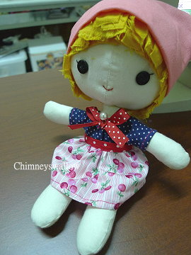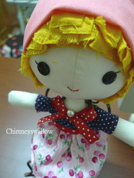 附註1:娃娃的身體縫好了很久,但一直沒有穿上衣服。這兩天總有個小小女孩來店裡玩,趁著昨晚縫了一套衣服,今天就連著娃娃送給了小小女孩。原本是想要縫成像小王子那樣金色頭髮的男孩娃娃,沒想到穿上裙子也很好看呢。