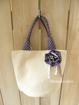厚帆布原本是縫紉師傅墊於工作檯上的不起眼布料,拿來拼接上紫色點點布料,再縫上自製蕾絲胸花,是不是有點優雅風出來了呢。