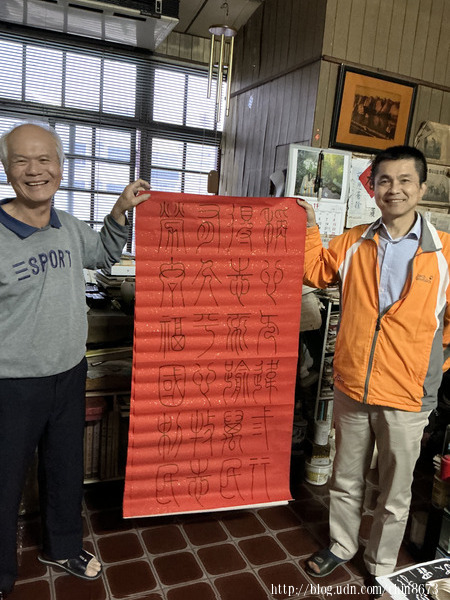 相片四、友人王之敏博士與楊文魁老師在擁擠雜置的「戰場」中心一方淨案前合影