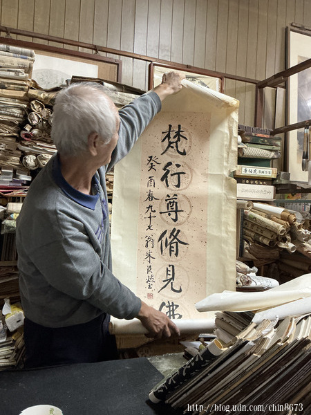 那是創作的「後場」,一切優雅從容在此褪去,露出藝術最赤裸的勤苦本質。滿牆懸掛名家之作及未裝裱的習作,地上、案頭、牆角,一摞摞習作宣紙堆疊成的丘巒。墨跡有新有舊,有滿意之作,更有無數塗抹廢棄的痕跡。它們被主人仔細保存,如同農人珍藏每一季的稻穀,捨不得丟棄任何一頁與筆墨交鋒的戰役紀錄。