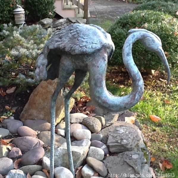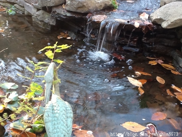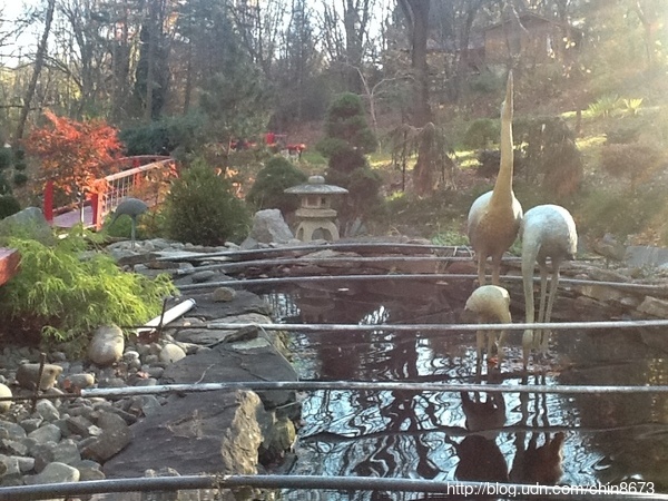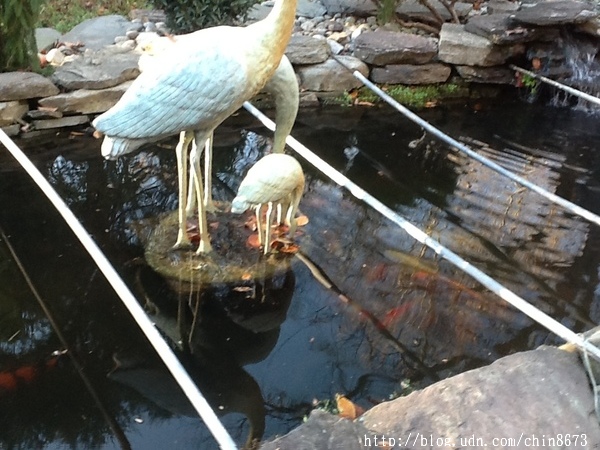 當鄧元玉由杜邦公司科學家[註三]的職業生涯退休後,她對園藝的熱情變成了痴迷。她找到另一位全能型的園藝造型師Jay。她與Jay將魚池擴建為長37呎、寬15呎、深4呎的容量,蓄水量達9000加侖,下游處有一較小的水生植物池。多年來,她收集了各式各樣五呎高青銅製可愛的鶴及一個鶴噴泉(crane fountain),鶴噴泉立於主池,美觀又為池塘供氧 添音。兩池間圍拱些勻稱的石塊,形成一個小瀑布。飛濺和涓流的水聲,引人著迷、靜思。