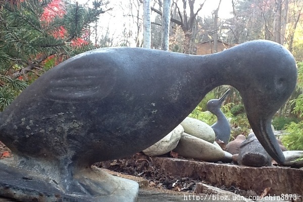 園內池塘旁的橡樹和櫸樹(beech)卻凋萎死亡,是因為上游的整治嚒?她不得而知,卻不得不僱來一輛大吊車,鋸下搬走6棵巨大凋零的樹木。巨樹移除,陽光移入,光線充沛下,原呈半休眠狀態的植物開始覺醒茂盛了,掉進池塘的葉子少了,樹的基座正好放置雕塑。大自然拿走一些東西,也送來一些東西。