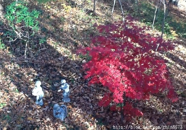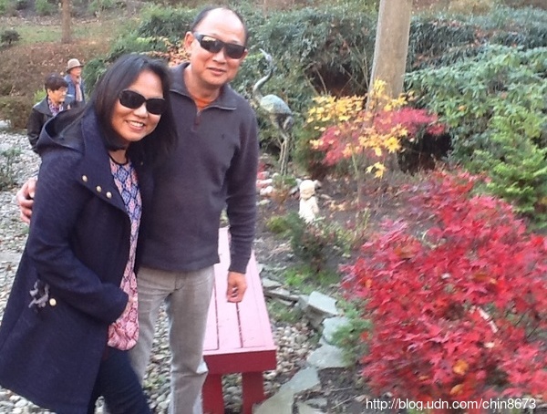 鄧元玉博士的家在隱密的樹林裡,林內有有洞天。由筆直大道轉入蜿蜒小路,再前駛幾秒,紅黃多彩的楓園就在右前方映入眼廉,哇,引得我這一車的五個人瞪大眼睛!