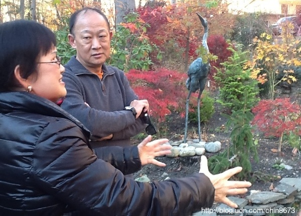 住在德拉瓦州的鄧元玉博士於退休後,除更加投入庭園愛好外,也拾筆創作,先於2011年5月以英文出版了《Shadows in the Lotus Pool》一書,並受華府作協的邀請來到華府 公開演講。隨後,她將該書譯成中文《荷塘綴影》,2012年3月起在《傳記文學》連載了十二個月;一年後(2013年4月)發行《民國。將軍。女》一書,那時我是華府書友會會長,就邀請她再來華府演講,因日期衝突,遲至2014年11月才終於請到她來書友會演講,我那時人卻在臺灣,錯過了她精彩的演講。簡體字的《民国。将军。女》於2015年1月在中國大陸出版。去年10月5日,華府五人(一輛車)很榮幸地受邀去欣賞她親手打造的世外楓園,那時楓葉雖未全彩,已令五人讚嘆她家庭園的幽寧雅緻;今年11月8日,於楓葉最艷彩的時刻再次受邀,這回華府去了四輛車共12人。