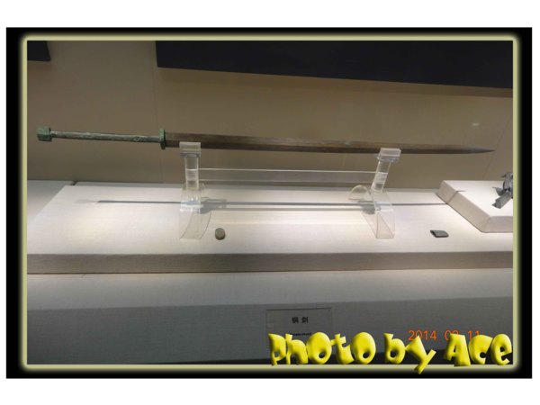 【下圖】 說到這把銅劍就厲害啦!相傳出土時,此劍是被重達三百多公斤的將軍俑給壓彎了,但想不到陶俑一拿開,立刻恢復原狀,而其鋒利之程度,能夠輕易地劃破十幾、二十張報紙,真是令人嘖嘖稱奇。讓人欽佩當時能有如此高超的工藝~~