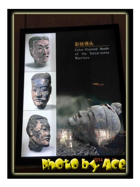 【下圖】 牆上有貼著當時出土時呈現彩色的俑頭,但因為氧化關係,所以無法保留原色,真是可惜~~