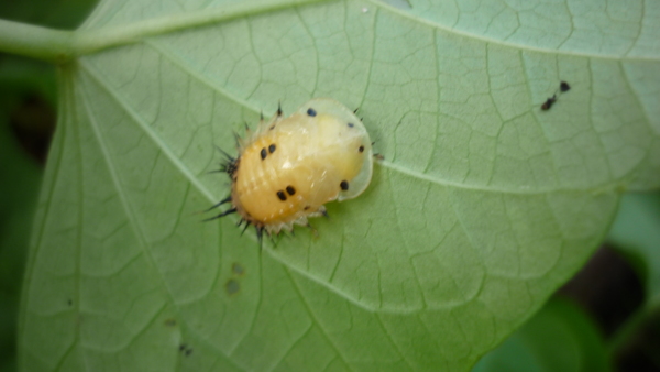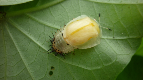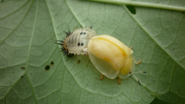 看出來了吧?地瓜葉果然營養豐富,瓢蟲寶寶正在脫殼,要「轉大蟲」了。
