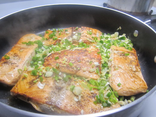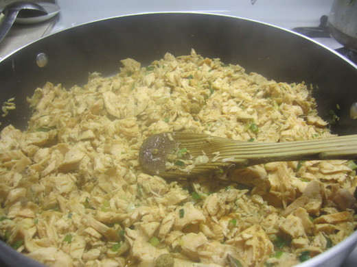第一次買鲑魚魚塊回來時,十分傷腦筋,不知要怎麼煮才能煮得没有魚腥味。就照我往常煮魚的方法,先用醬油,黑胡椒,很多香料醃15 分鐘,再用一點油兩面煎一煎,因為魚塊很大,外面熟了,裡面還是生的,我只好用鍋鏟把魚塊切小塊一點,再把切好的葱,薑,蒜放進去一起爆香炒一下,好巧不巧這個時侯,一個好友打電話來哈啦,我就邊煮魚邊心不在焉的講電話,等我講完電話,我的鲑魚塊已經不知什麼時侯變鲑魚鬆了。聞一聞,魚腥味已經被香味蓋過去了。好吃到不行,從此這道鲑魚鬆從此成為老爺的最愛,連最挑嘴的小學文也吃得津津有味。