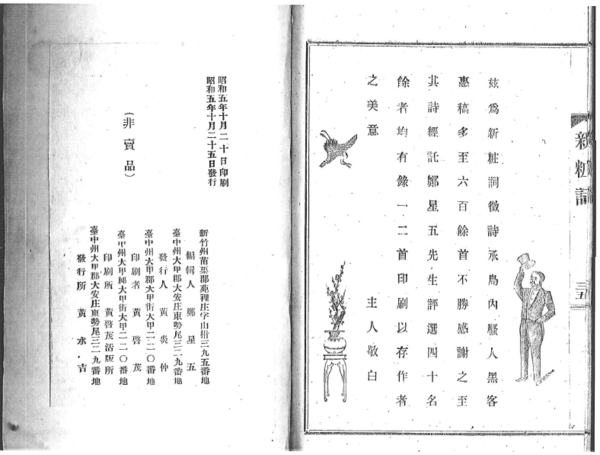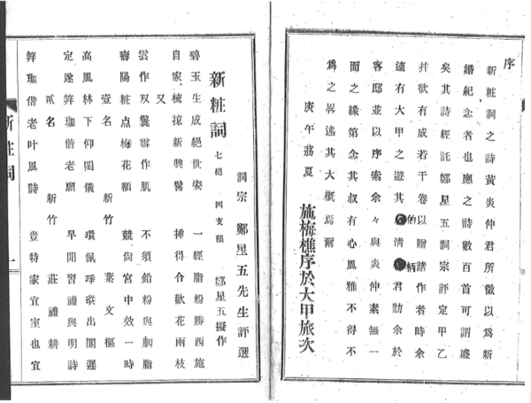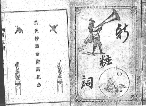 《新粧詞》,扉頁為「黃炎仲新婚徵詩紀念」,卷首例言:「是詩為黃炎仲君新婚徵詩紀念」,新粧詞書名,由此而來。卷末有主人敬白:「茲為新粧詞徵詩,承島內騷人黑客惠稿,多至六百餘首,不勝感謝之至。其詩經託鄭星五先生評選四十名,餘者均有錄一二首印刷,以存作者之美意。」此書分成兩部,前部是徵詩前四十名,依序刊登。後部為落選選錄,以交卷為序。