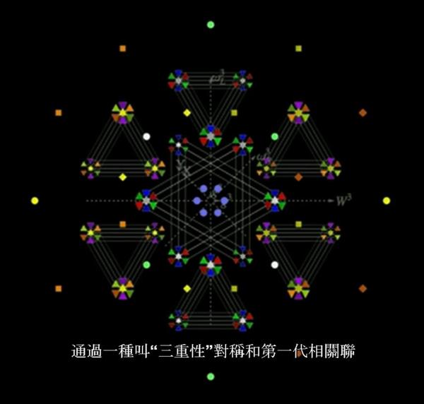 物理學除了是研究宇宙運作原理的學問,其實是美學信仰者。這張圖包含了弱力、強力重力與各種基本粒子(質子、中子、電子、夸克....)交互運作的幾何圖形,符合嚴謹數學關係,且是完美與對稱結構。有些位置還沒有找到對應粒子,將引領學者朝此方向繼續尋找與探索。雖然對於這些學理一知半解,但背後透出的美學訊息,卻是人人都可以感受到。