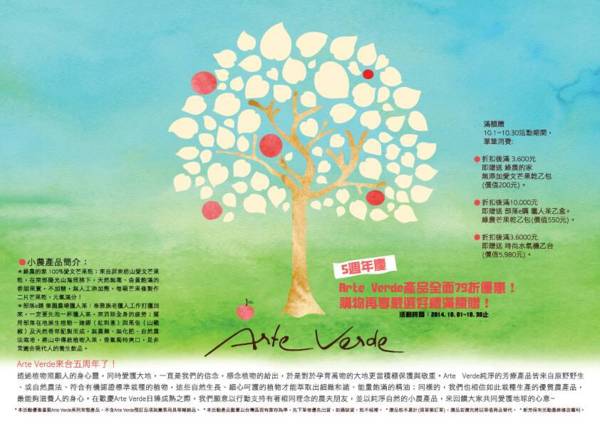 Arte Verde 5周年慶產品全面79折優惠,滿額再送嚴選好禮~即日起至2014.10.30