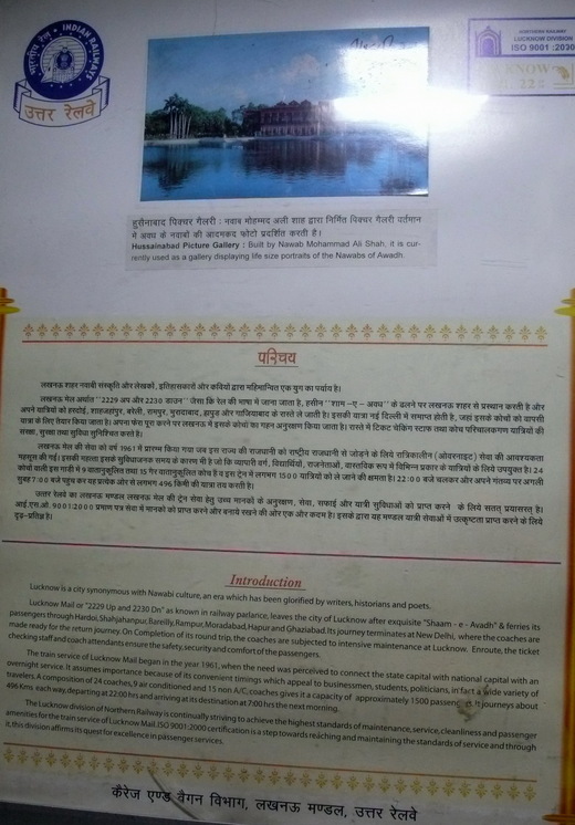 湊近再往下瞧,這塊則描述LucknowMail的歷史由來,大意是其、始駛於西元1961年(民國50年),為連結印度最富省會Lucknow與首都德里的車班,讓其間近五百公里(493km)距離的旅程一夜就到,便利嘉惠兩地居民,若是坐公車的話,時間就很難說了甚或是遙遙無期哩!此班列車品質還有ISO的認證,可見其還真是煞有其事般。