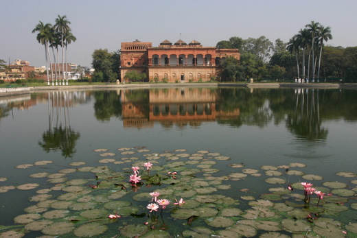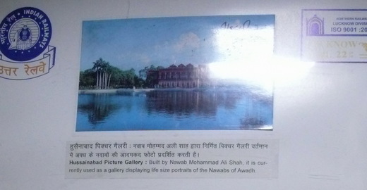民國100年2月4日夜,坐車號2229的Lucknow Mail火車,由Lucknow趕往德里,因票買的晚了,沒有座位,只好在車廂之間找一空位,將在Gorakhpur車站買的印度圍巾兩塊鋪地,鑽進隨身睡袋睡下,就如此這般的打發這夜,到底是「隨遇而安」亦或「蠅營狗茍」,那就不得而知,反正人累隨便一窩,也管不了那麼多了;因夜裡冷風依舊刺骨,無法好眠,思緒陣陣飄浮、、、、起來數次、走動閒逛,見車廂旁貼一告示,驟看下景緻十分眼熟,細讀後原來是Lucknow的Hussainabad Picture Gallery;那年去Lucknow時見其在Hussainabad公園內,旁還立有一高高鐘塔伴著,當時此些皆曾駐足、留影為念。