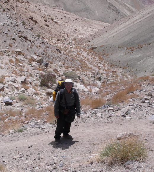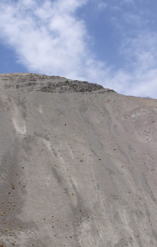 綿延大山山頂凹處,隱約有石堆、風旗影子,如果這裡真是Angla(LagoLa),望著其前面這片近垂直的碎石坡,心頭不禁涼了半截,記得民國七十年間,和舍弟去登奇萊東陵,爬奇萊北峰時也是一片碎石坡,當時裝備重而坡面上又沒繩索固定,爬登時常滑溜,一次竟滑到趴著無法着力,好在拉住一小松樹才止住,叫舍弟丟下繩索,靠其才解了一難,如今僅有自己,非得小心大意不得。