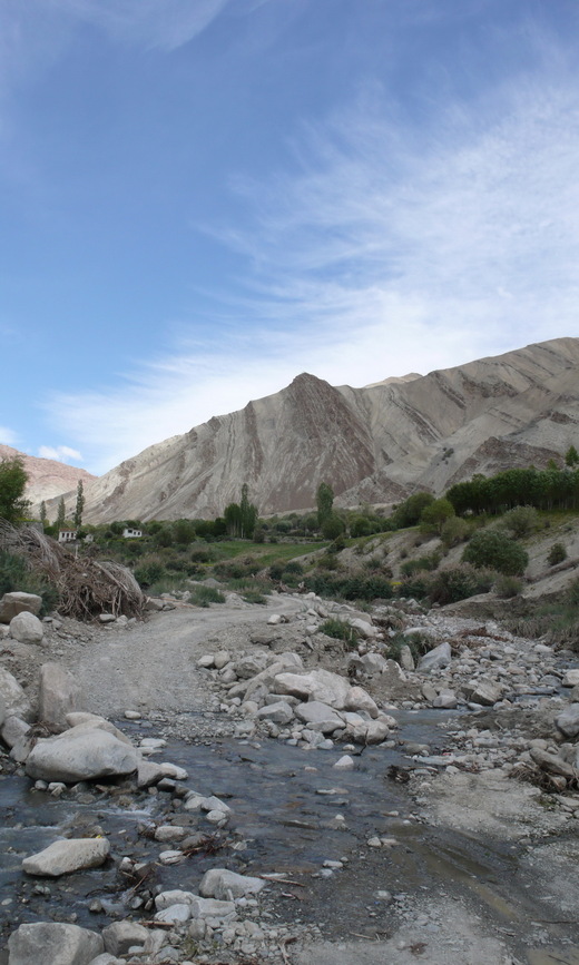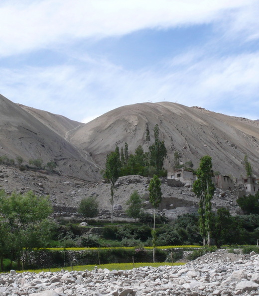 到Ang途中遇到一人趕馬而來,「酒烈、酒烈」一聲招呼而過,已經看到Ang村,過了今天看到的第一棵楊樹及用土夯成的土牆後Ang村就在眼前,在路邊喝幾杯奶茶,賣家說Ang也有Homestay及旅社,且明早8點有車到列城,我因想參拜Temisgam Gompa遂決定住Temisgam,路上找了家Guest House350盧比管早晚兩餐,收拾休息一下就前往Temisgam Gompa,Gompa建於山巔,因山已日漸崩坍寺院已沒收容僧眾,僅留一喇嘛照應耳!