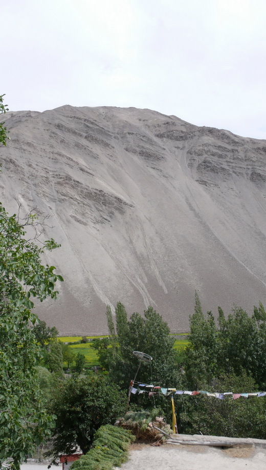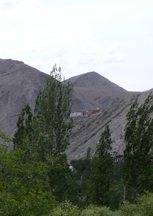 進入大殿中間主祀為觀音玉佛,在佛龕中僅露面容,下方有其全身佛照,玉佛旁為十一面觀音聖像,參拜完後進入另一古老殿中,內裡有釋迦及蓮華生大士等聖像,參見及給完Donation,就到廊亭下觀望,這裡是最高點可以望見我從Angla的來時路及其中峰峰相連之勝境,沿著溪水綠林不斷,白楊木楊樹,麥田油菜田等縱橫於兩山谷之間,逞目四望十分壯觀,不覺間竟忘時矣、、、、