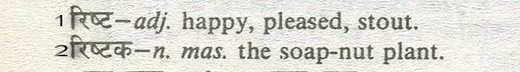 Sapindus「印度的肥皂」--印度文Ristaka「唎瑟迦柴」,中文「無患」正好與梵文Rista(高興的,滿意的,喜歡的,結實的)等意義相同。