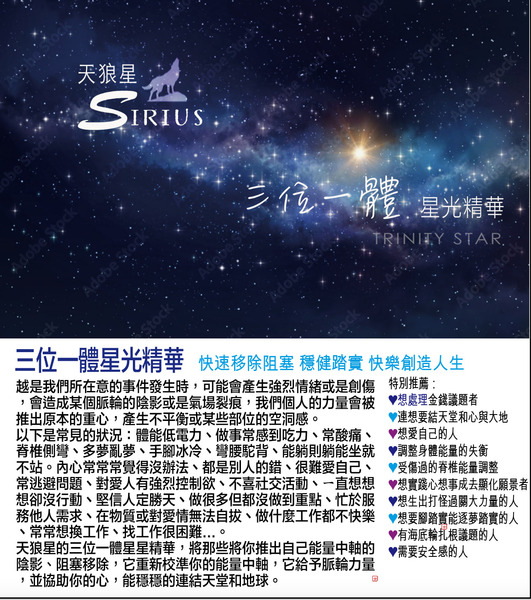 天狼星三位一體星星精華,將那些將你推出自己能量中軸的陰影、阻塞移除,它重新校準你的能量中軸,它給予脈輪力量,並協助你的心,能穩穩的連結天堂和地球。