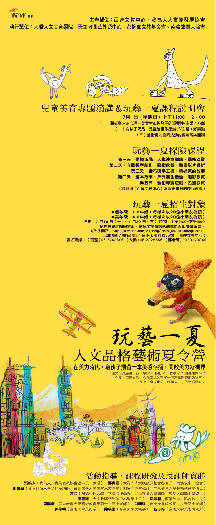 美術教育的目的,並不是要將我們的孩子變成為畢卡索、梵谷、或張大千,也不僅止於情感與美感的抒發;今年夏天,百達文教中心邀請大橋人文美育學院的專業師資,將為您揭示美育的另一個面向,美育還可以刺激孩子的大腦皮層,激發孩子的創造能力,它也是孩子認識、組織外在世界的一種方式,更可以讓孩子透過它得到手、眼、心的整合,讓孩子的身心更協調,擁有更健全的心智發展。