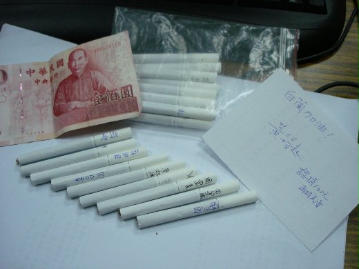 聽到我這番話,大家開始紛紛掏出自己的香菸,還有人捐出自己身上的塑膠夾鍊帶,主動替我收集大家簽了名字捐出來的菸。「我這裡收到十八支,有沒有人再捐兩支出來,湊滿二十支,剛好一包菸好不好?」(寫到這裡,開始感覺自己可以去富比士拍賣會場打工叫賣了)