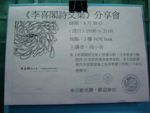 已經來過很多次的柿子昨日搶得頭香,至於第一次來此的譚大哥,據說已經快要走到紅毛城附近的書店了,好不容易才折返回來,氣喘吁吁地走上位於二樓的「有河」,鷹姐的號召力更是魅力無法擋。